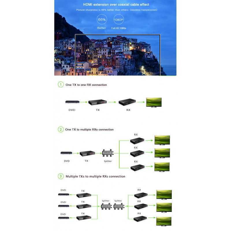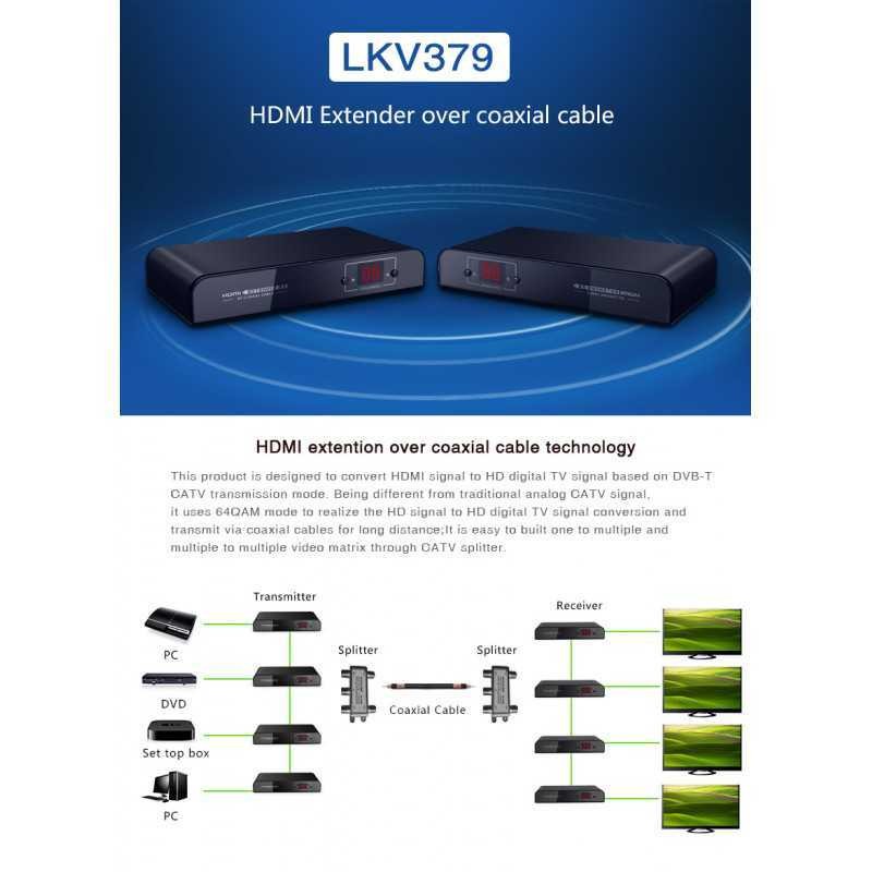 LKV379 HDMI sinyal hattı uzatıcı, HDMI sinyalini DVB-T CATV iletim moduna bağlı olarak HD dijital TV sinyaline dönüştürmek için tasarlanmıştır. Geleneksel analog CATV sinyalinden farklı olarak, HD sinyalini HD dijital TV sinyaline dönüştürmek ve uzun mesafeli koaksiyel kablolar üzerinden iletmek için 64QAM modunu kullanır,