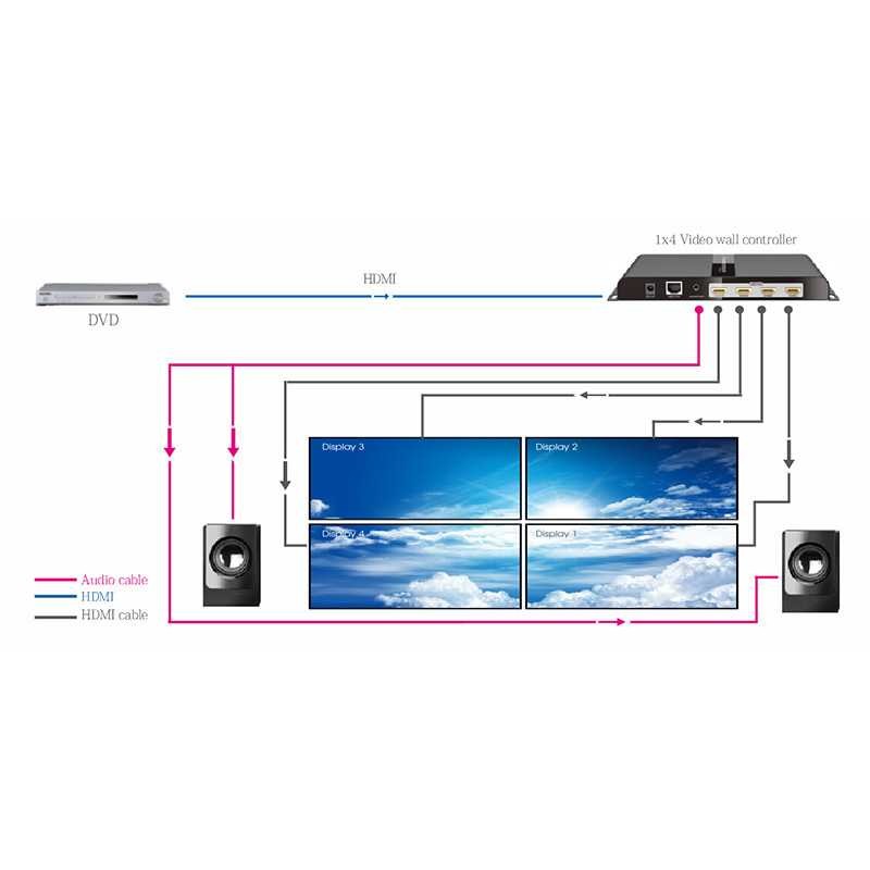 Bu video wall kontrolörü, 2x2 büyük video wall için mükemmel bir çözümdür, 1xHDMI kaynak girişini ve 4 monitöre 4xHDMI çıkışlarını destekler. Full HD 1080P@60Hz'e kadar HDCP uyumlu HDMI sinyal kaynağını destekler. Kulüplerde, sergilerde, lobilerde ve diğer vb. gibi yerlerde video wall uygulamaları için idealdir.