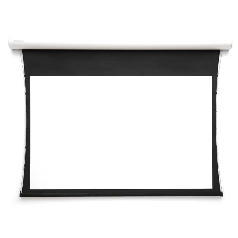 Mükemmel düz perde yüzeyi için gerdirmeli sistem ile duvara veya tavana montaj için şık tasarımlı elektrikli projeksiyon perdesi.