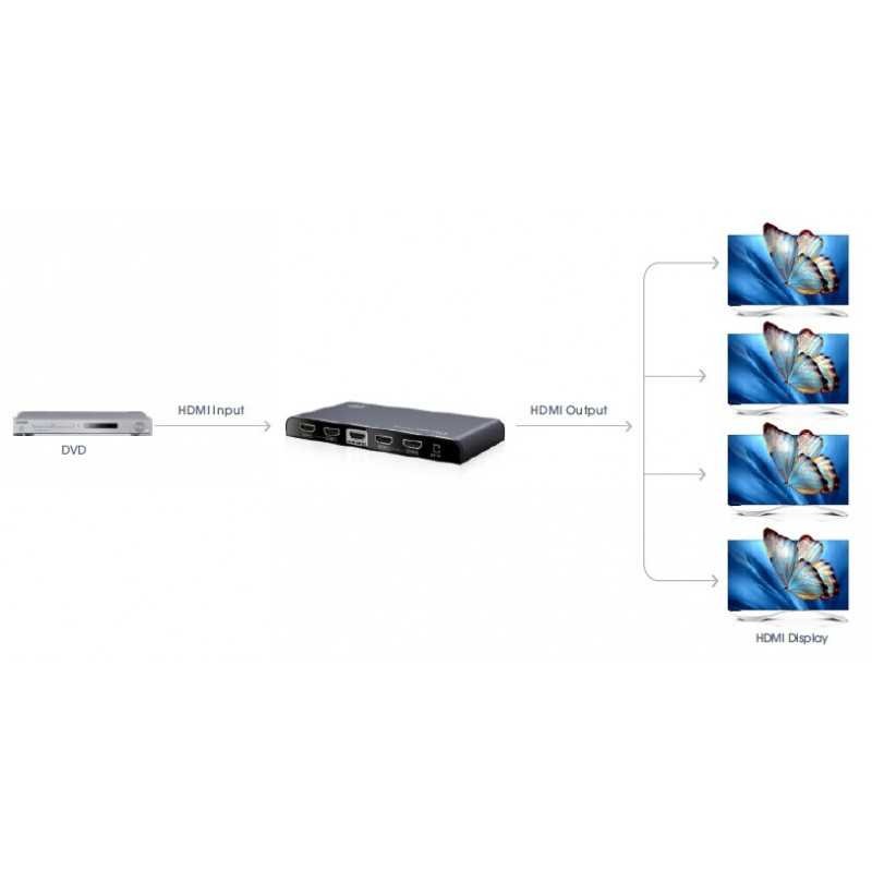HDMI spiltter; Tek kanallı HDMI sinyalini, STB, DVD, Blu-ray çalıştırıcıları, PS3 gibi cihazlardan 4 yollu eşzamanlı olarak projektöre, DLP, LCD'ye veya diğer HD ekranlarda gösterebilir. 4K@60Hz ve HDCP 2.2'ye kadar. HDMI 3D ile uyumludur.